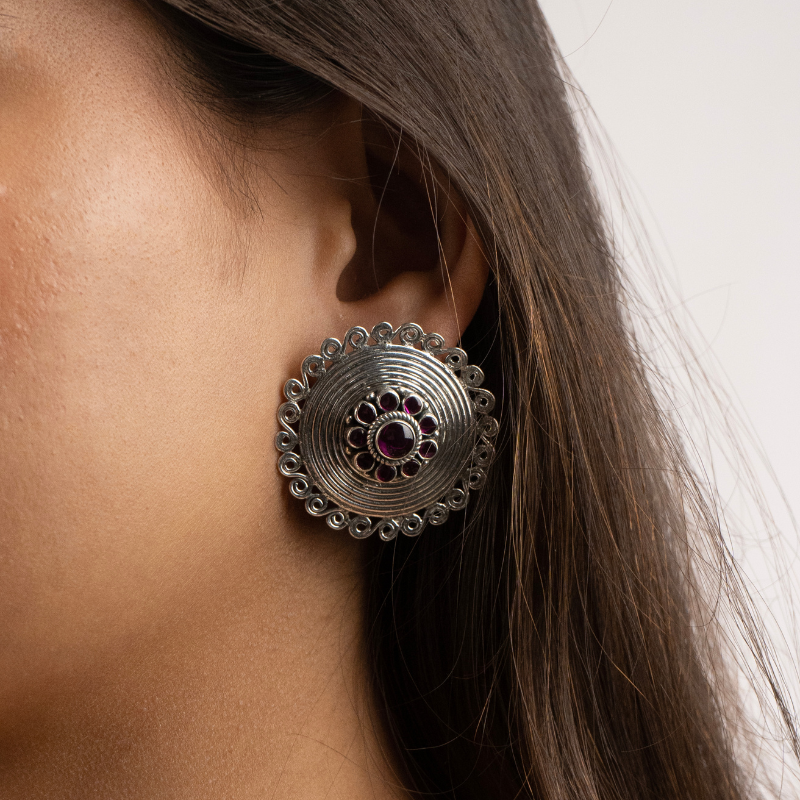 This wide handcrafted silver cuff is detailed with floral studded motifs and hints of red stone accents that catch the light beautifully. Its regal width makes it a true statement accessory, perfect for pairing with sarees, lehengas or even contemporary festive fits. Designed in oxidized silver for heritage charm yet styled for today’s celebrations, it is hypoallergenic, comfortable, and made to stand out in bridal and festive looks.