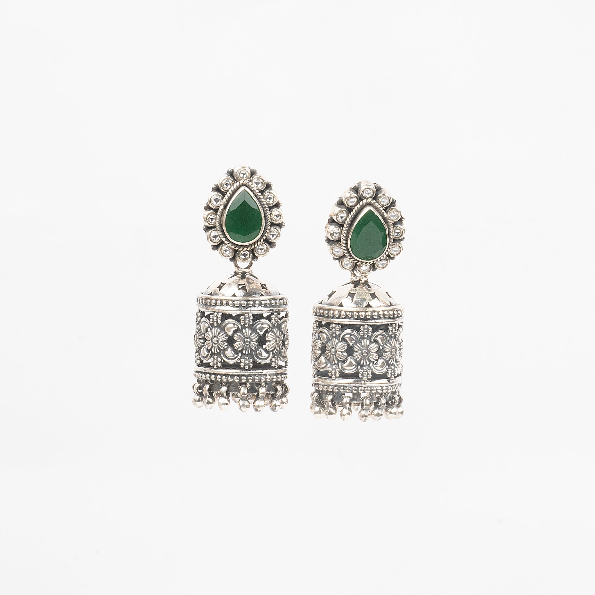 The Ruby Drop Temple Jhumkas carry the beauty of heritage design into today’s celebrations. Crafted in oxidized silver with temple-inspired detailing and ruby-toned drops, they radiate a rich festive vibe. Lightweight yet striking, they are perfect for pairing with traditional attire and add a devotional touch to weddings, pujas and festivals.