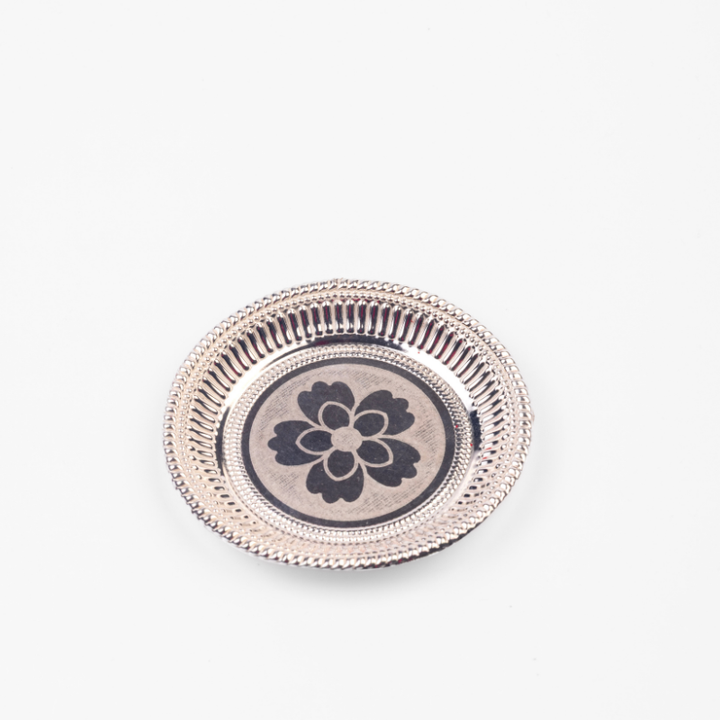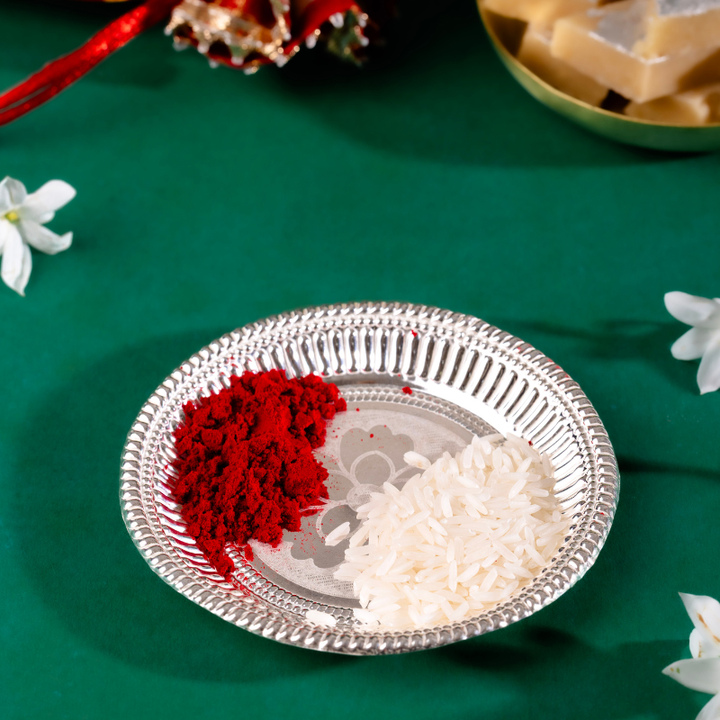The Aaradhya Silver Ritual Plate is crafted in 92.5 sterling silver with a beautifully engraved floral motif and a detailed rim that reflects traditional elegance in a modern, minimal style.