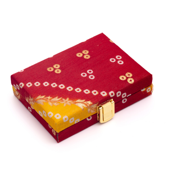 Packaging: Bandhani fabric box with gold-tone clasp
