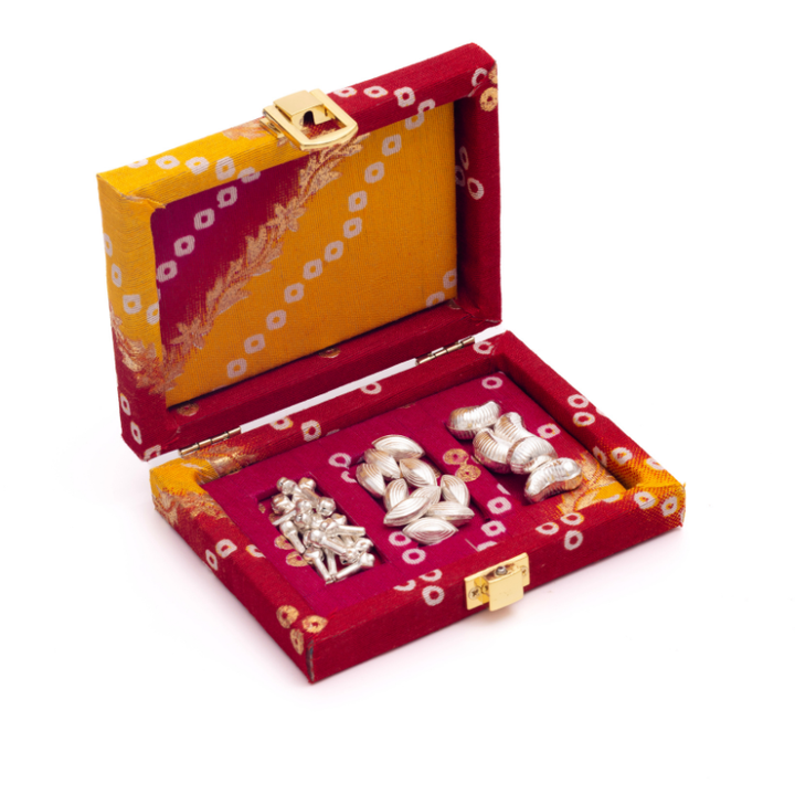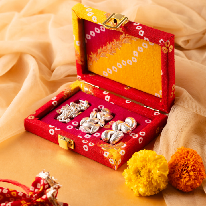 Together, these three elements form a powerful combination of prosperity, positivity and sacred intention. The set is presented in a vibrant bandhani fabric box, inspired by classic wedding textiles. The rich colours and gold-tone clasp elevate the experience without taking attention away from the significance of the silver contents. It feels festive, traditional and premium—perfect for handing out at haldi ceremonies, griha pravesh, pooja return gifts, festive occasions and milestone celebrations.