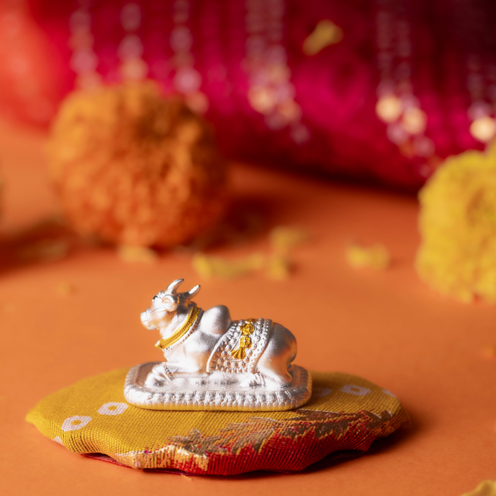 The Blessings of Nandi Silver Idol is a beautifully handcrafted piece made in 99 percent pure silver, created to bring peace, strength and divine grace to every celebration. As the revered vahana and devoted guardian of Lord Shiva, Nandi embodies purity, patience and blessings, making this idol a meaningful gift for weddings, poojas, griha pravesh and festive occasions.