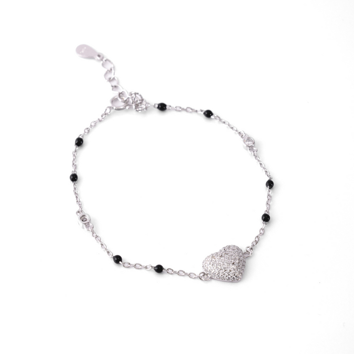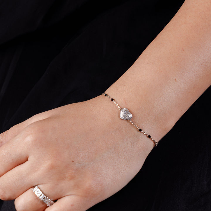The Blush Love 92.5 Silver Mangalsutra Bracelet combines tradition and trend with its hallmarked sterling silver in rose gold finish. Featuring black beads, sparkling stone accents, and a pavé heart charm, it’s the perfect silver mangalsutra bracelet for modern women — ideal for daily wear or gifting.