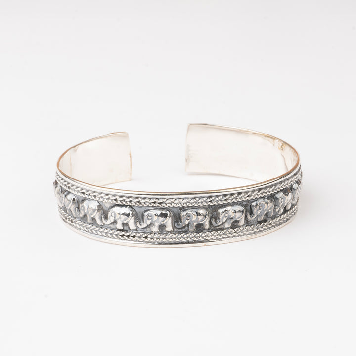 Silver kada with elephant motifs symbolizing strength and festive fortune.