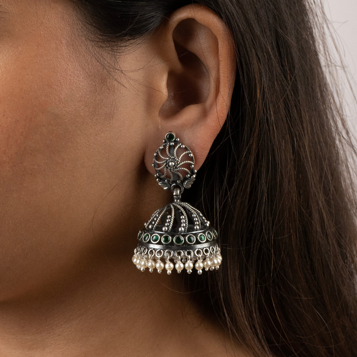 Classic silver dome jhumkas with emerald accents for timeless festive charm.