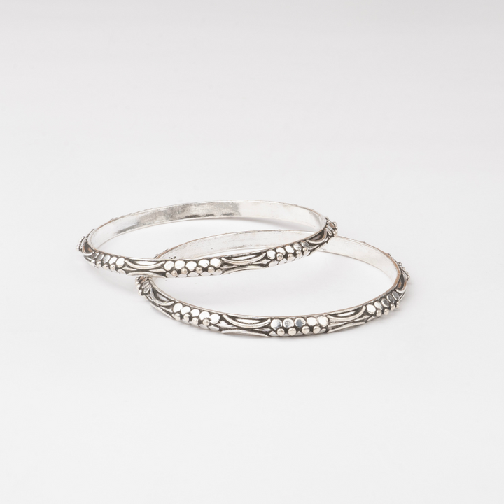 The Floral Engraved Bangle is a classic piece that reflects the artistry of traditional silverwork. Crafted in 92.5 sterling silver and finished with an oxidized antique polish, it features detailed floral engravings interspersed with dotted motifs. Elegant and versatile, this bangle is perfect for festive dressing, temple wear, and cultural celebrations, while also pairing beautifully with daily ethnic outfits.
