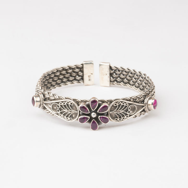 The Floral Mesh Kada is a beautifully detailed piece, crafted with a woven oxidized silver band and highlighted by a central floral motif. Available in two variants — accented with deep red stones or sparkling white stones — it adds a touch of refined charm to your festive styling. Bold yet graceful, this kada pairs effortlessly with sarees, lehengas and anarkalis, making it a versatile choice for weddings, cultural gatherings and family celebrations. Lightweight, hypoallergenic, and timeless in appeal, it is a jewellery box favourite for every season.