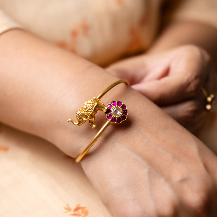 Embrace the blend of strength and beauty with this exquisite bracelet in a radiant gold finish. Featuring a finely crafted elephant on one end, symbolizing wisdom, strength, and good fortune, and a vibrant floral motif on the other, signifying grace, beauty, and new beginnings, this bracelet is a true embodiment of balance and harmony. Perfect for elevating any ensemble with a touch of elegance, it serves as a meaningful gift for your loved ones, whethers to celebrate achievements, milestones, or simply to add a statement piece to their collection. This unique design ensures an unforgettable presence, making it a thoughtful token of affection and good wishes.