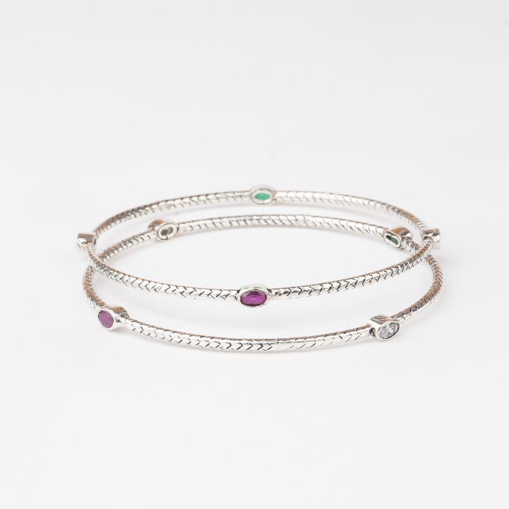 The Multi Stone Bangles bring colour and sparkle together in perfect harmony. Crafted in 92.5 sterling silver with an oxidized finish, they feature intricate floral cluster motifs studded with polki stones in dual hues. The vibrant play of colours makes them ideal for weddings, festivals, and celebratory occasions, while the timeless design ensures they remain a cherished part of your jewellery collection.