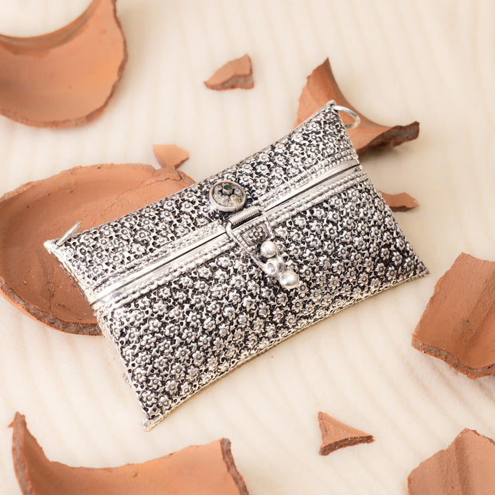Introducing the Radiant Charm Oxidized Silver Clutch, a perfect blend of elegance and practicality. Crafted from 92.5% BIS Hallmarked Silver, this exquisite clutch combines traditional craftsmanship with modern functionality, making it an ideal accessory for any special occasion.