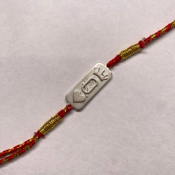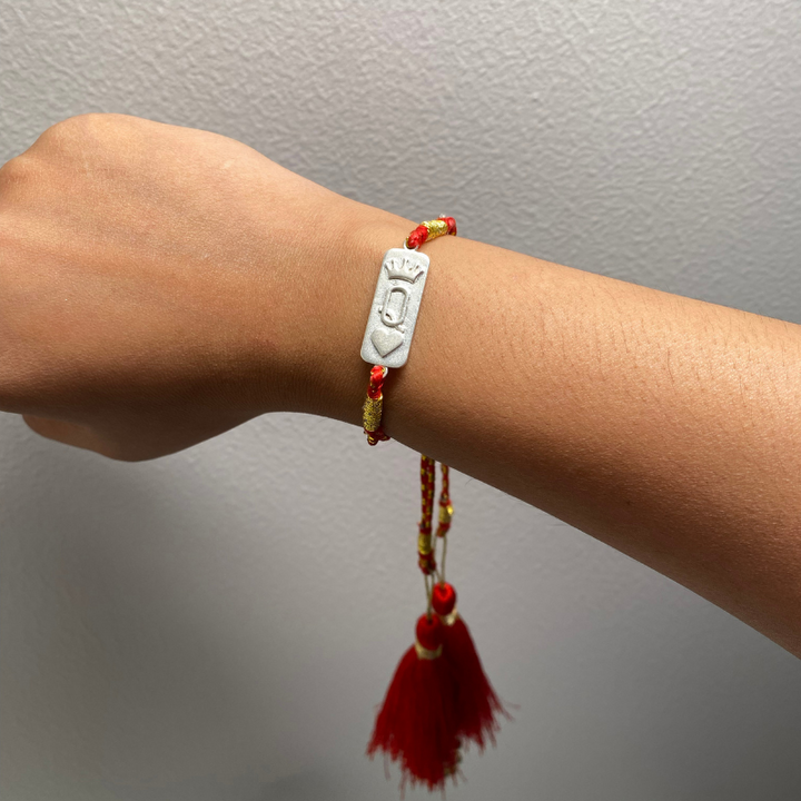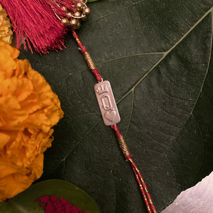 Crafted in 92.5 hallmarked silver with a crowned "Q" of hearts motif, this statement piece is tied with rich red-gold thread and playful tassels—perfect for the bhabhi who rules with love and flair.