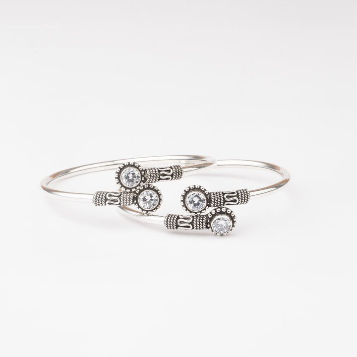 The Round Stone Kada pair is crafted in oxidized silver with twin round white stones that give it a timeless elegance. Minimal yet graceful, these kadas are designed to complement both festive and everyday ethnic looks. Lightweight, hypoallergenic, and adjustable, they are a versatile addition to your jewellery collection and a thoughtful gift for any celebration.