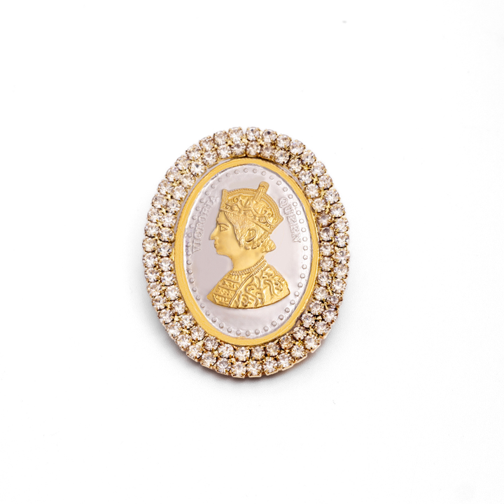The Royal Queen Silver Brooch features a 99% pure silver coin showcasing a finely detailed Queen portrait, set within a brilliantly studded artificial-stone border. Its oval silhouette and radiant sparkle bring an elegant, royal charm that complements sarees, lehengas, indo-western ensembles and wedding outfits.