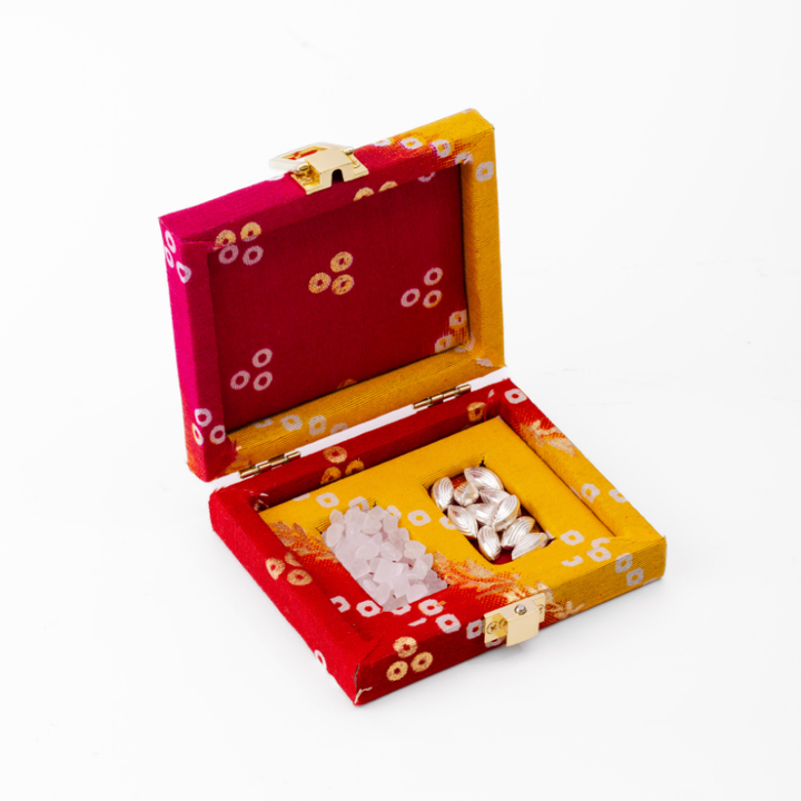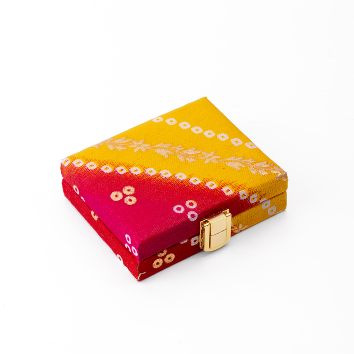The set is presented in a stunning dual-tone bandhani box, crafted from traditional wedding textiles and finished with a luxurious gold-tone clasp, giving it a festive and elevated appeal.