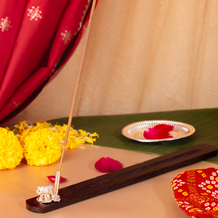 Thoughtful, elegant and culturally rooted, this incense holder makes a memorable gift for weddings, griha pravesh, festive celebrations and spiritual occasions. The silver elephant elevates the piece with its sacred significance, while the wooden base keeps the aesthetic warm and contemporary.