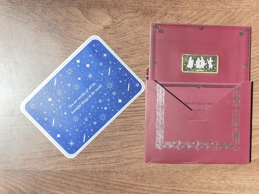 Each card comes in a personalized envelope, beautifully sealed and adorned with your guest's name—adding grace and intention to every gesture. Inside, a heartfelt message card is paired with a stunning sealed coin, featuring a wedding-themed motif engraved on the front. The back can be customized with the couple's names, wedding date, or even your wedding logo, making it a deeply personal memento of your celebration.