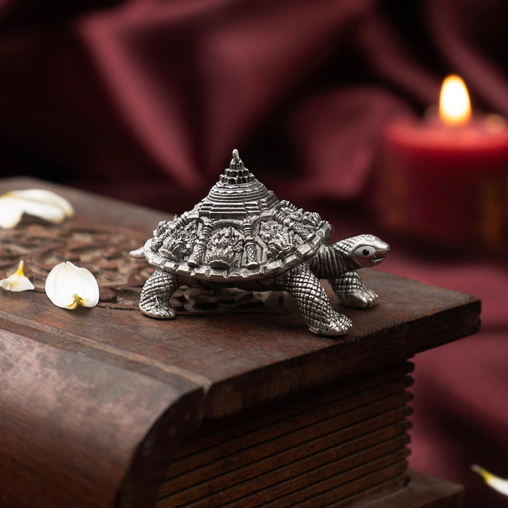 Crafted in 92.5% sterling silver with an antique oxidised finish, the Silver Tortoise is a powerful symbol of stability, longevity, and prosperity. Its shell is intricately detailed with the Ashtalakshmi motifs and the Sri Yantra, revered in Vastu and spiritual traditions as bringers of divine blessings, harmony, and abundance.