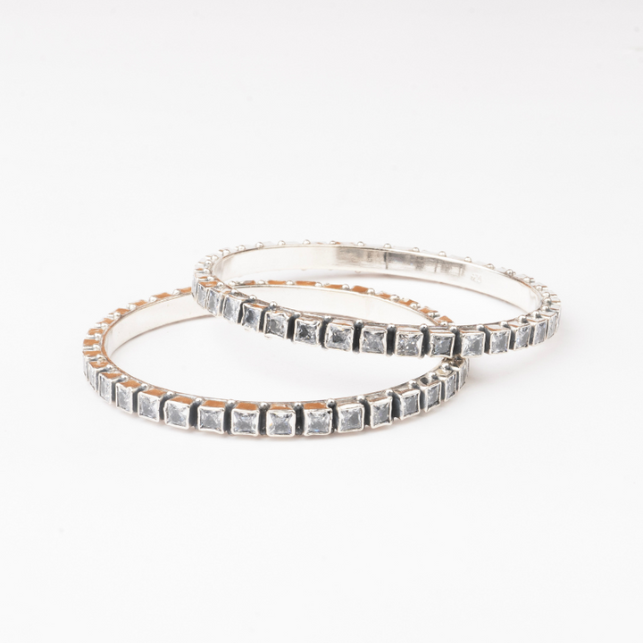 The Square-Set Bangle is a celebration of refined beauty. Crafted in 92.5 sterling silver, it features a seamless row of square-cut stones that shimmer with every movement. Sophisticated yet versatile, it is ideal for weddings, festive gatherings, and special occasions, bringing understated sparkle to both ethnic and modern outfits.