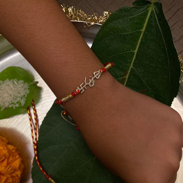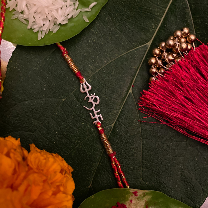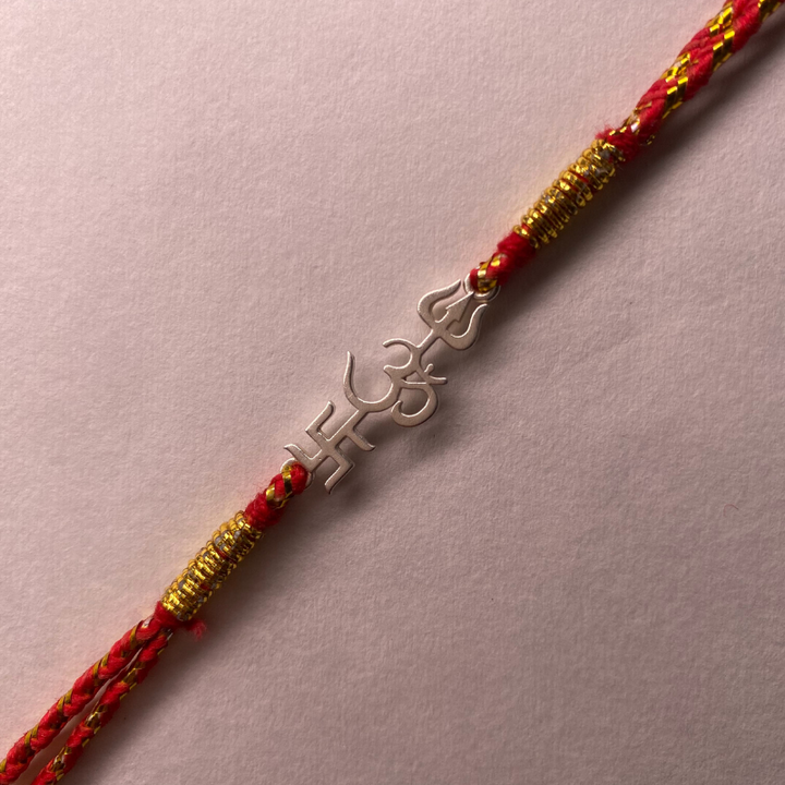 Crafted in 92.5 hallmarked silver, this Rakhi brings together the sacred symbols of the Trishul, Om, and Swastik—each holding deep spiritual meaning.